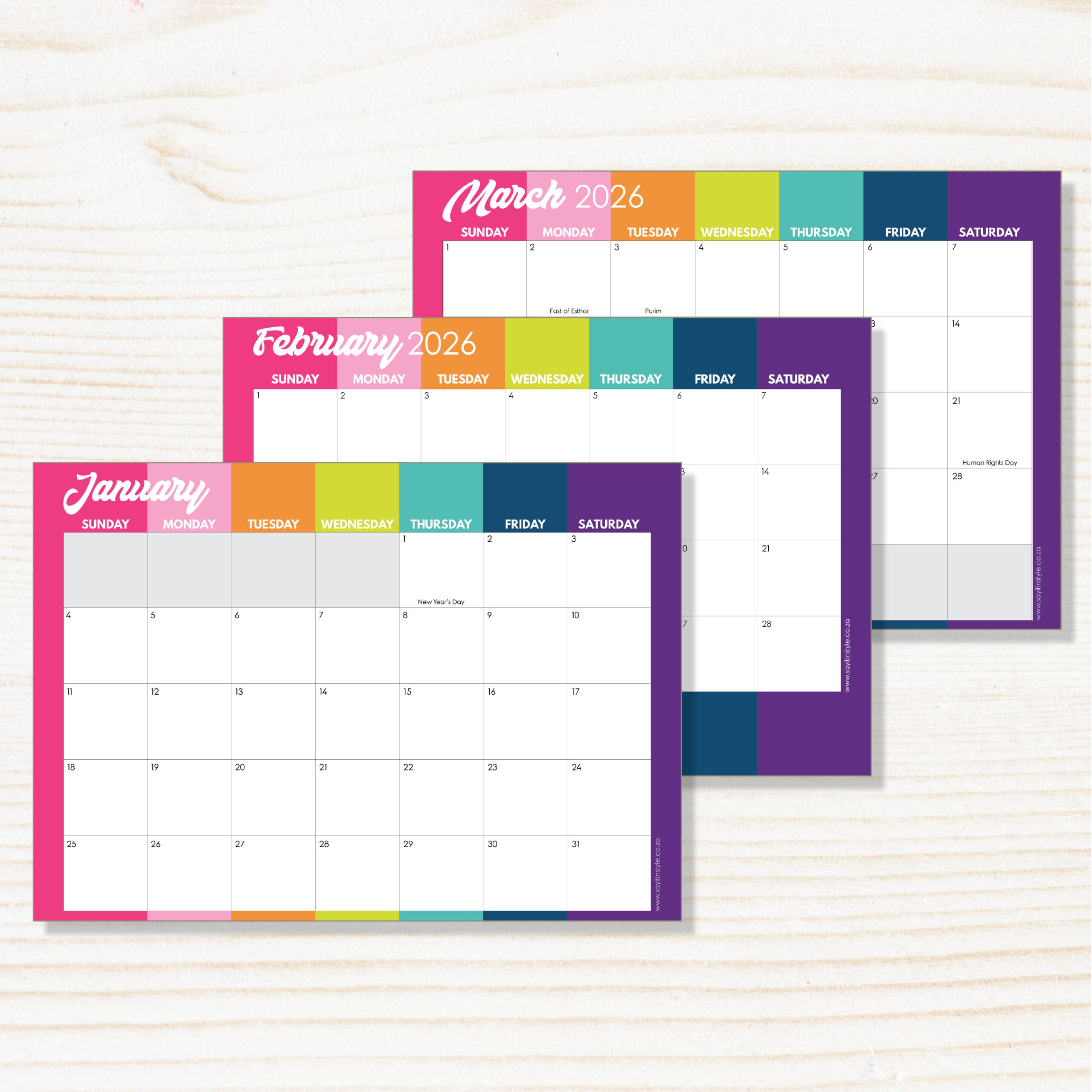 This Monthly Calendar comes as individual sheets with magnets on each sheet to hang on the fridge. The South African public holidays and limited religious holidays are included.